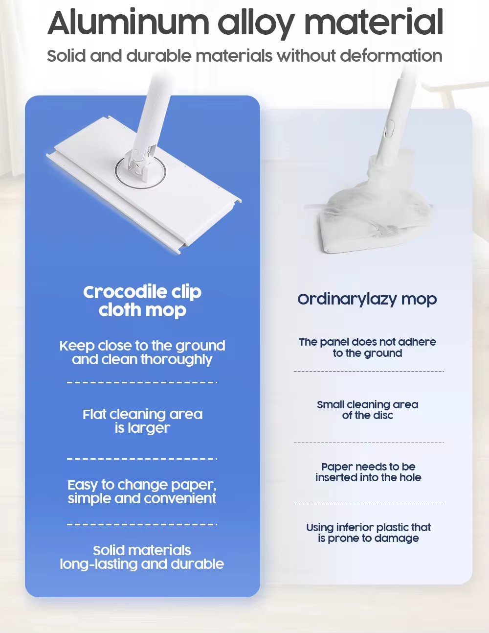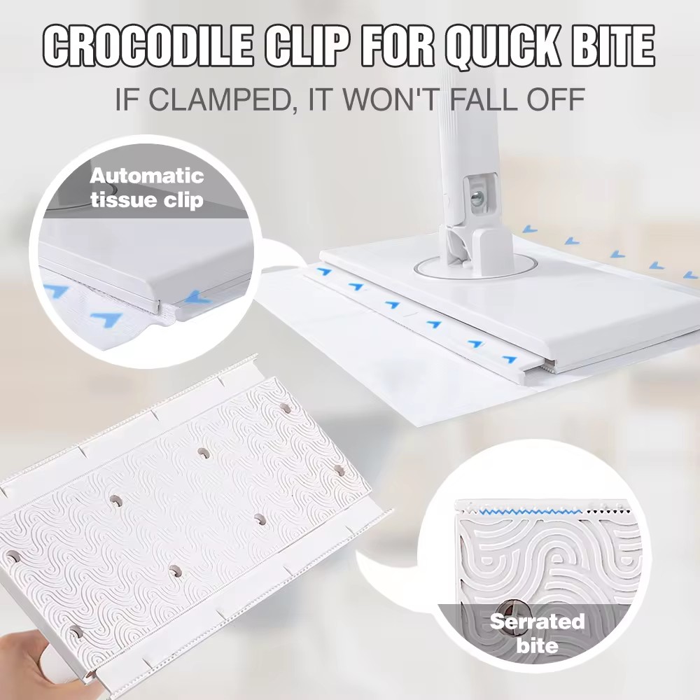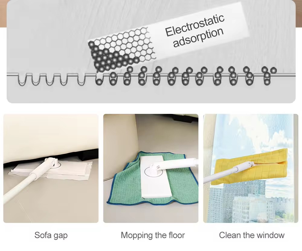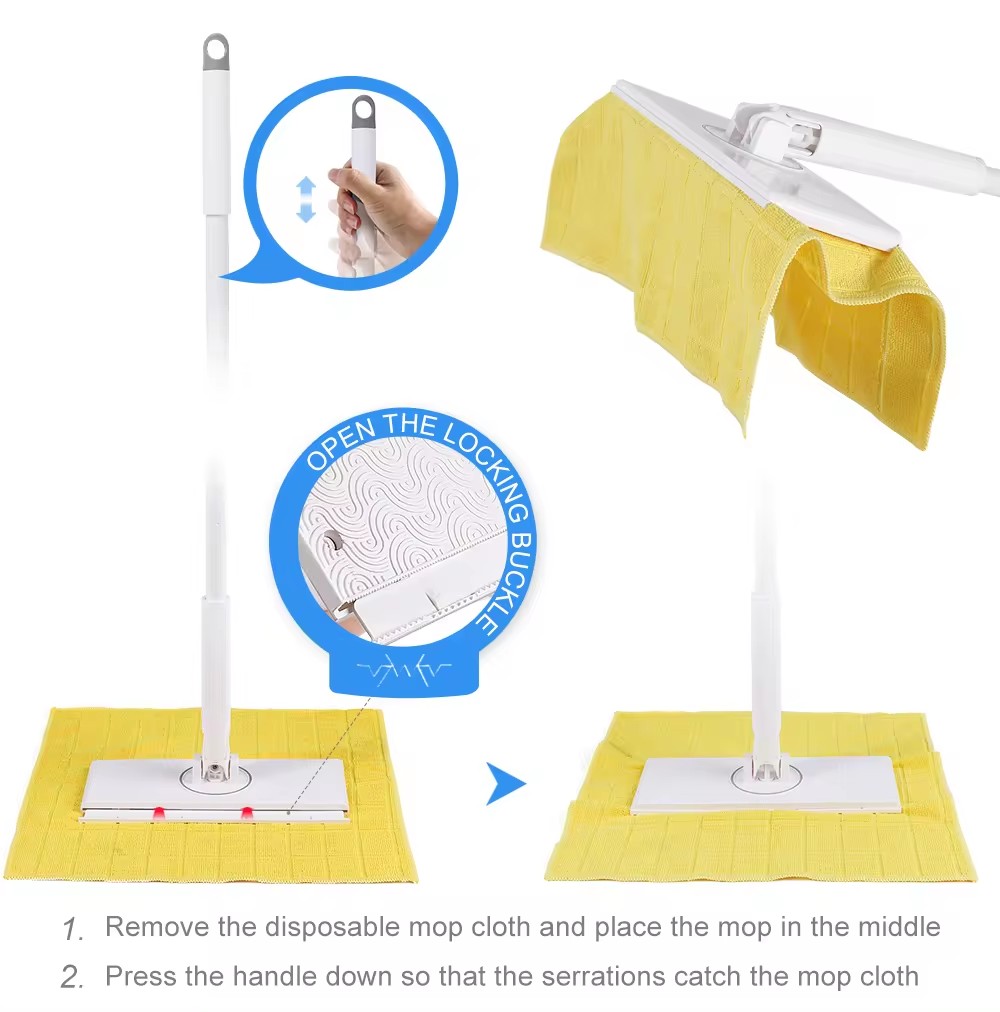 Hands-free release: press the handle to open the clips and drop the dirty cloth without touching it.